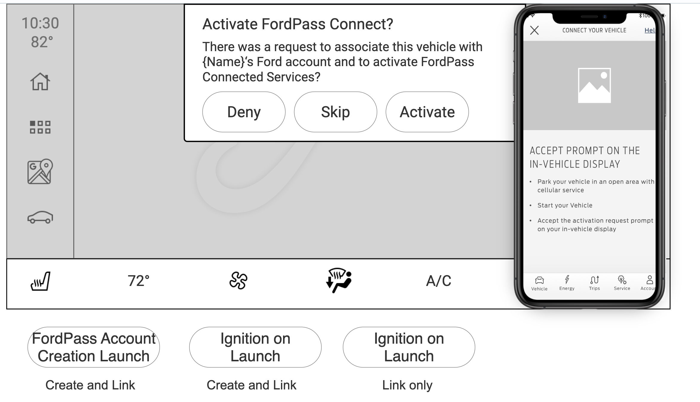 We started by understanding the setup and connection flows between the devices and how they were similar or ways they differentiated for the customers. Once we understood the different setup processes and what users would need to do once they got in the vehicle, I started creating wireframes to visualize the new flow within the system.