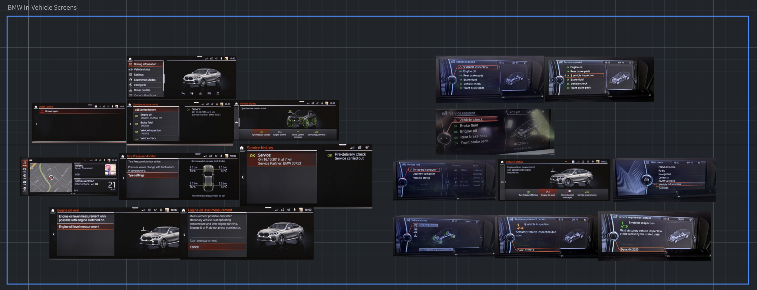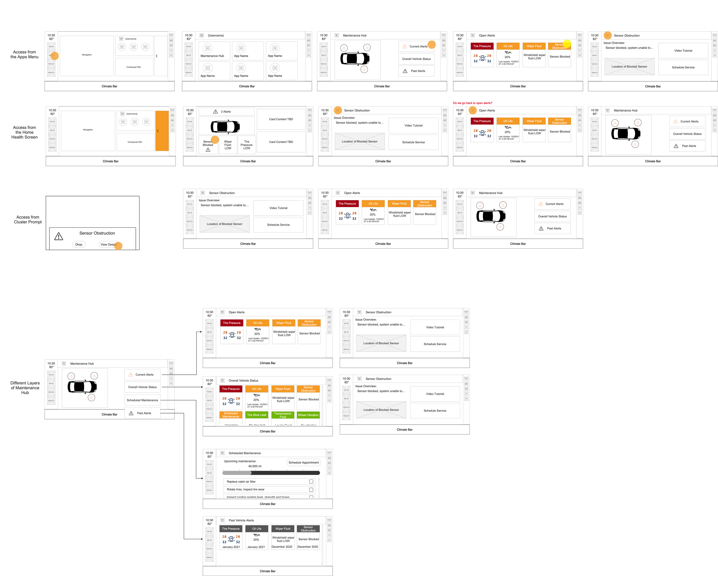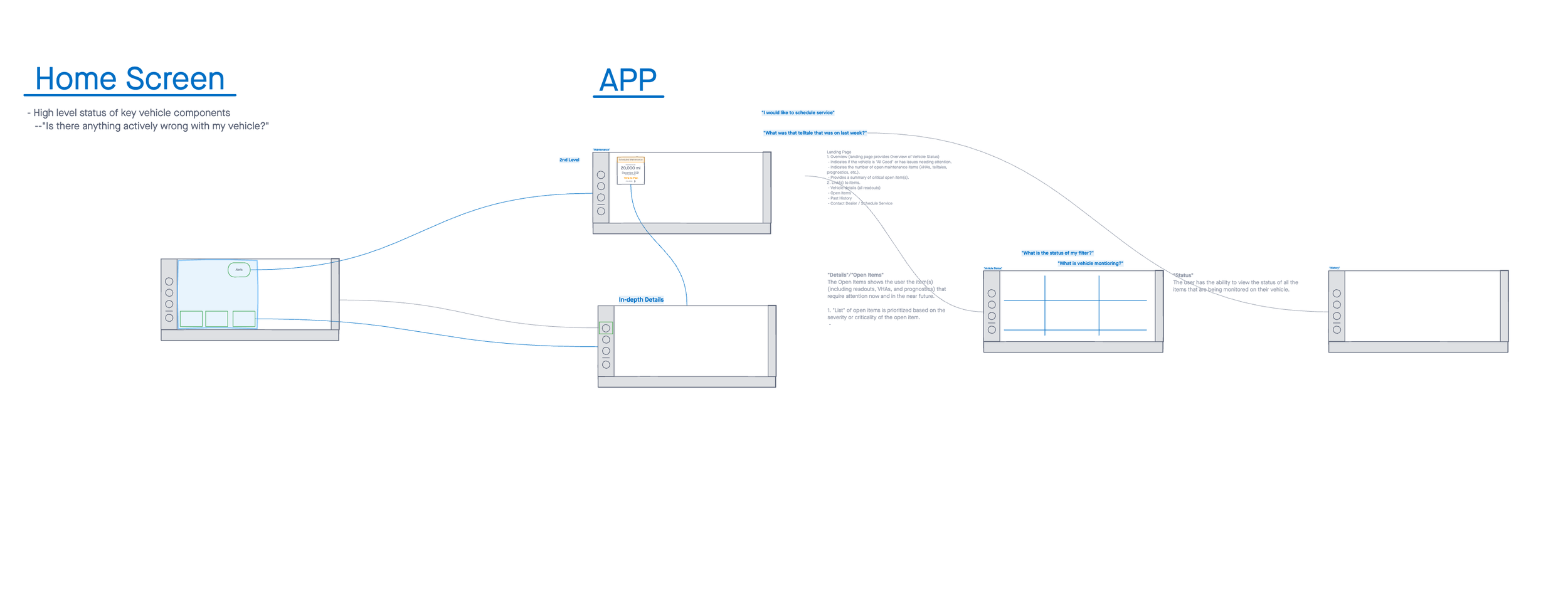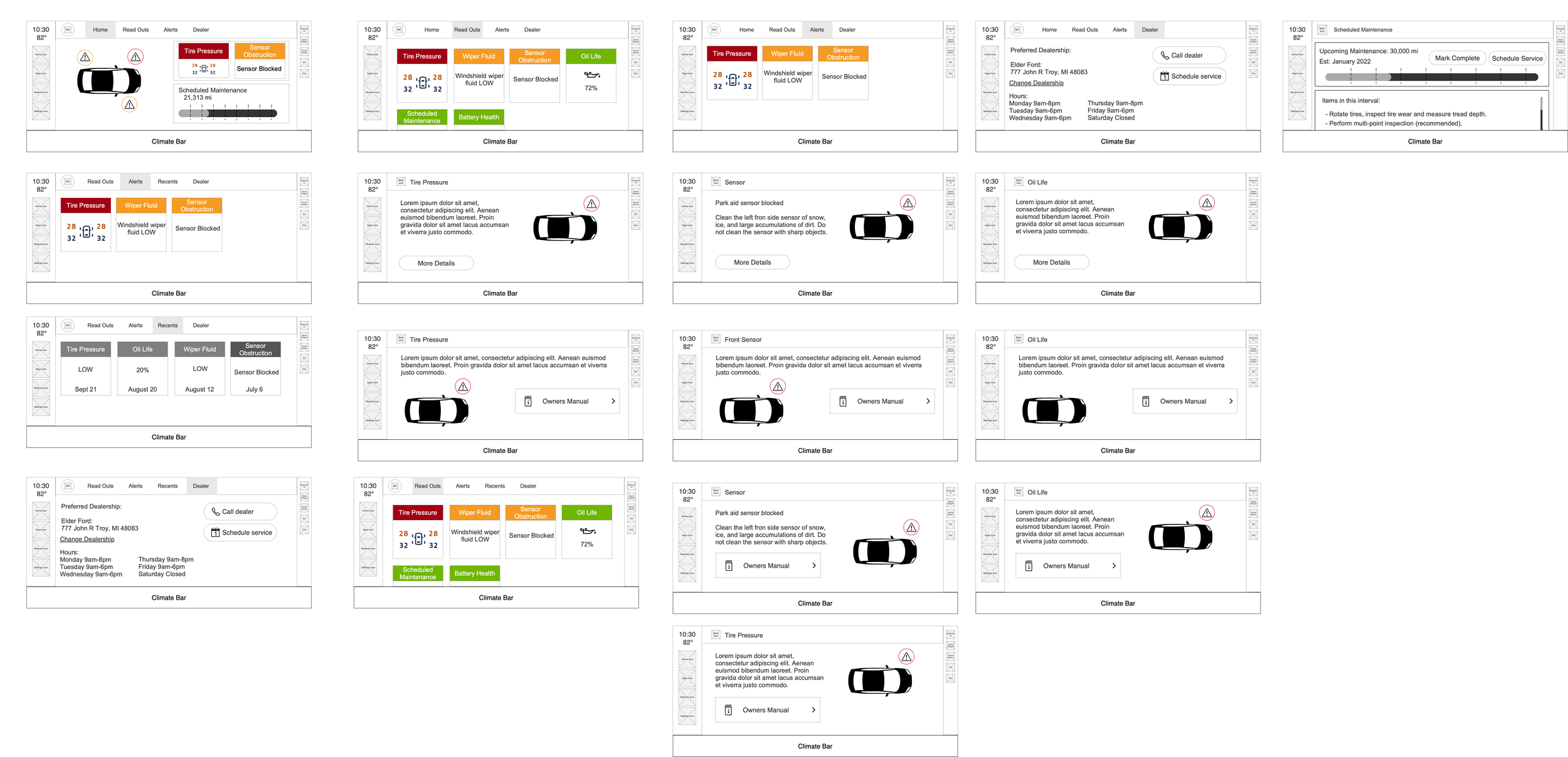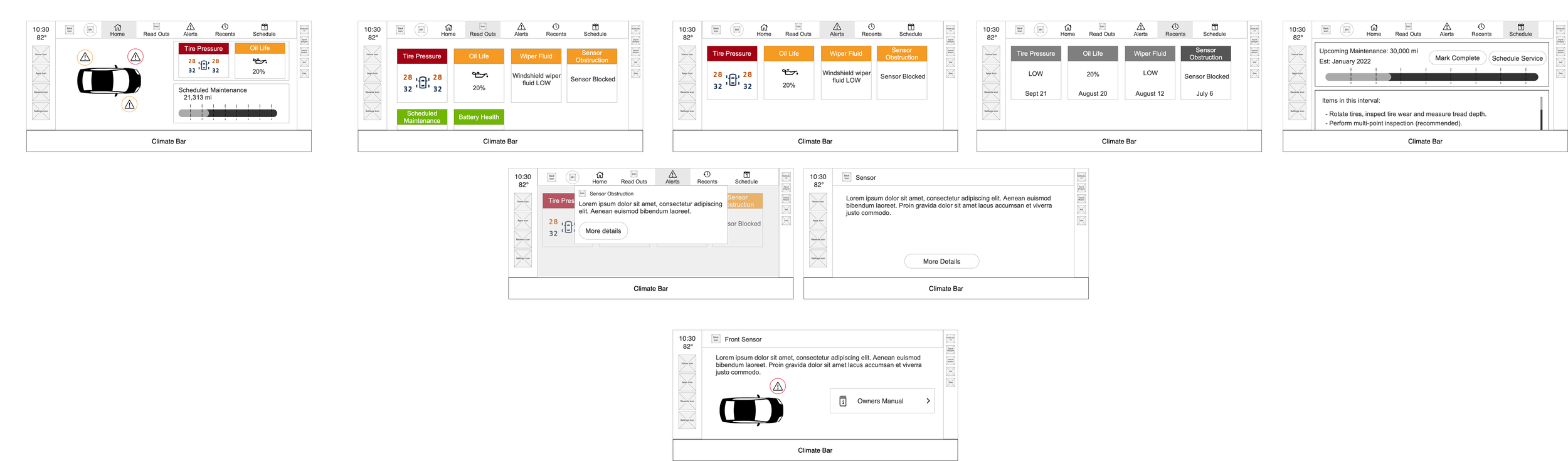 After we had a solid direction of what we wanted the users to have access to, I benchmarked the current experiences out on the market in BMW and Mercedes. Once I had an understanding of the competitors, I used all the information gathered to create wireframes to take to the team to convey the design direction we were heading in.