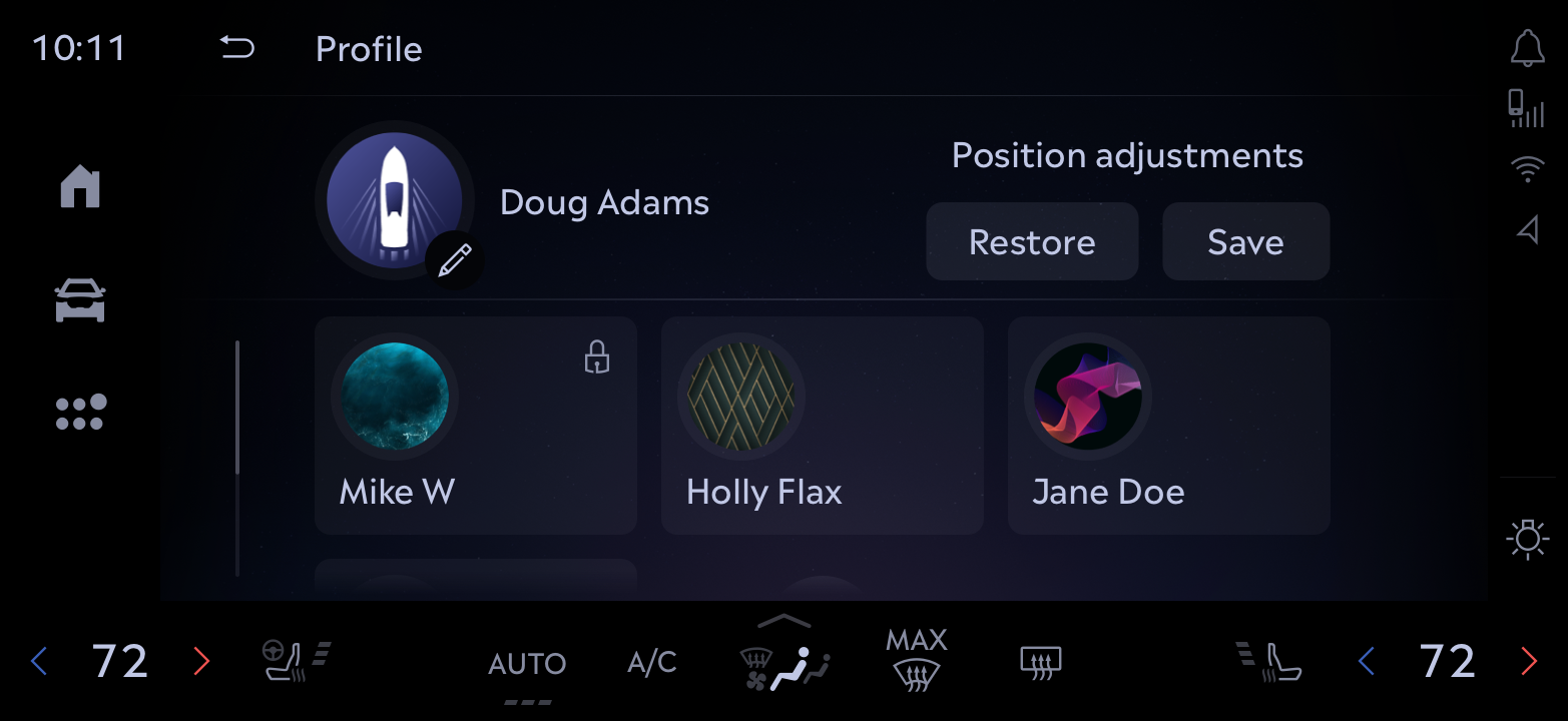 “Establishing profiles enables each driver to set preferences to appear when entering the vehicle. These include apps, contacts, and favorite destinations, plus customized seating, steering wheel and mirror positions.”
