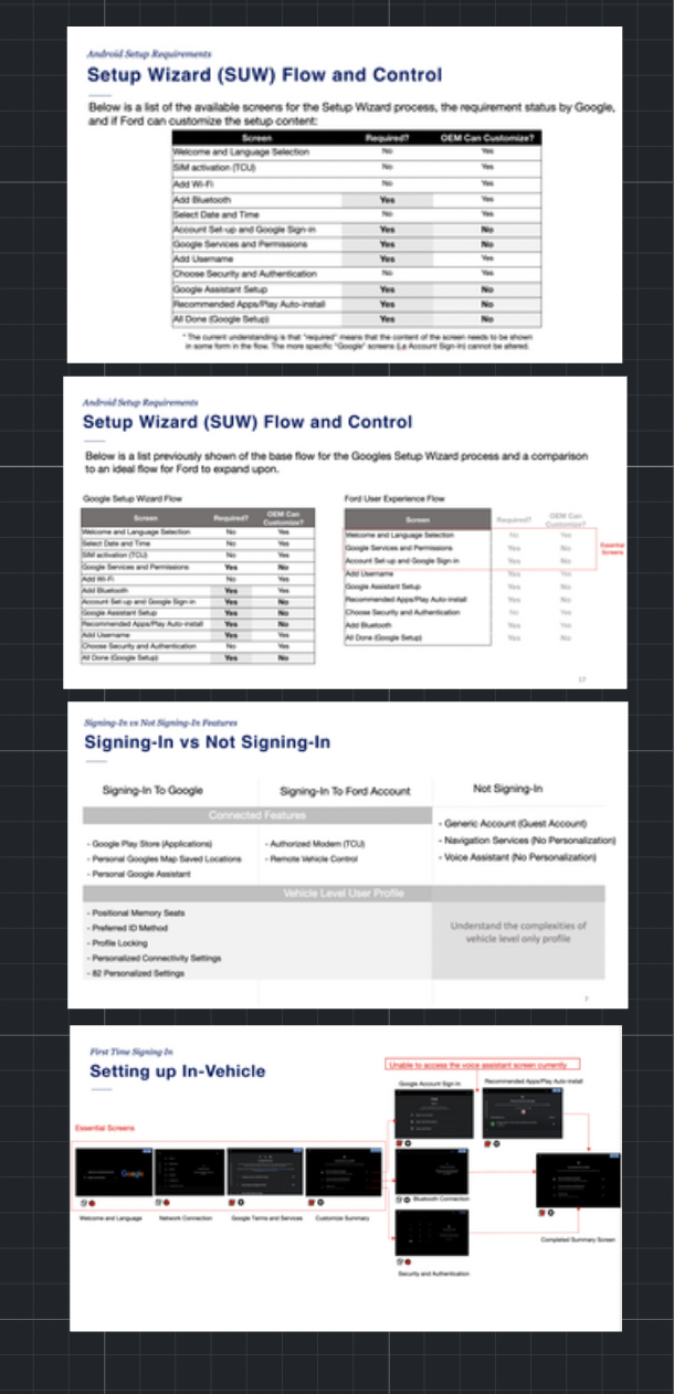 Before the partnership announcement with Google, Ford wanted to build upon their last iteration of profiles; which only consisted of profile name and association with a seat position and identification method. Once the partnership was announced with Google, we were challenged to create a robust onboarding experience that integrated the user into the new ecosystem, as the new partnership completely redesigned the system from scratch.